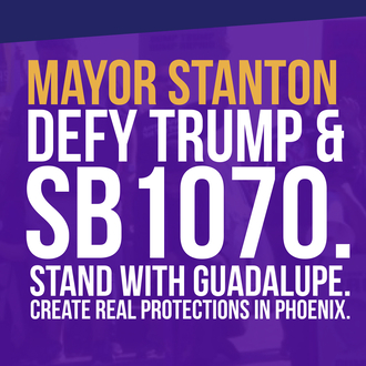 Tell Mayor Greg Stanton to Defy Trump & SB1070, Stand with Guadalupe, Create Real ProtectionsLast night, in front of her own family, Phoenix police helped federal deportation agents deport Lupita García de Rayos. Mayor Stanton made a statement in opposition but needs to put his words into action. Phoenix police are among the most violent in the country and actively profile Black, Latinx, and migrant communities. We are asking Mayor Stanton to put his promise into action starting with putting an end to Operation Order 4.48, a Phoenix PD order that mandates and cements ICE/Police collaboration and that is dripping with racial profiling language. We ask that he lead by example and not be intimidated by Trump nor the racist proposals of the AZ State Legislature currently being considered to increase law enforcement, further criminalize immigrants and punish sanctuary cities. Lupita was deported because Sheriff Arpaio criminalized her in an unconstitutional raid. Many more Phoenix residents will face the same fate unless Mayor Stanton transforms police practice in our city. Mayor Stanton needs to know that we won't let him bend under Trump's pressure and that the people in Phoenix are who he needs to be listening to in order to create real safety in the city. Please sign the petition and spread the word2,155 of 3,000 SignaturesCreated by Puente A.